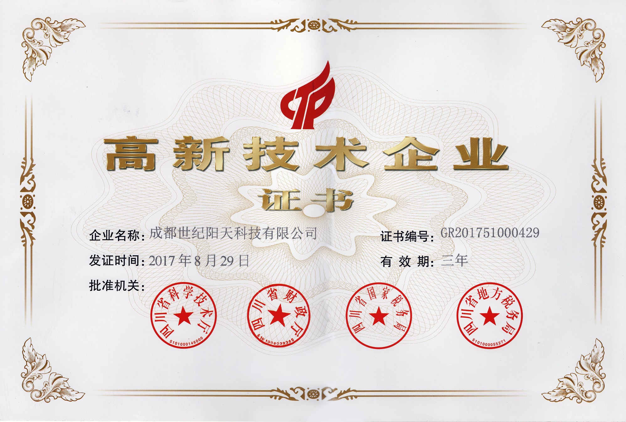 2017年,成都世紀陽天科技有限公司收到并積極響應由國家科學技術(shù)部、財政部、國家稅務總局頒發(fā)關(guān)于印發(fā)《高新技術(shù)企業(yè)認定管理辦法》的通知,依據(jù)《高新技術(shù)企業(yè)認定管理工作指引》的規(guī)定,經(jīng)過數(shù)月的籌備工作,并經(jīng)四川省科學技術(shù)廳、省財政廳、省國家稅務局及四川省地方稅務局專家的層層評審,最終順利喜獲“四川省高新技術(shù)企業(yè)證書”,證書編號為:GR201751000429。
